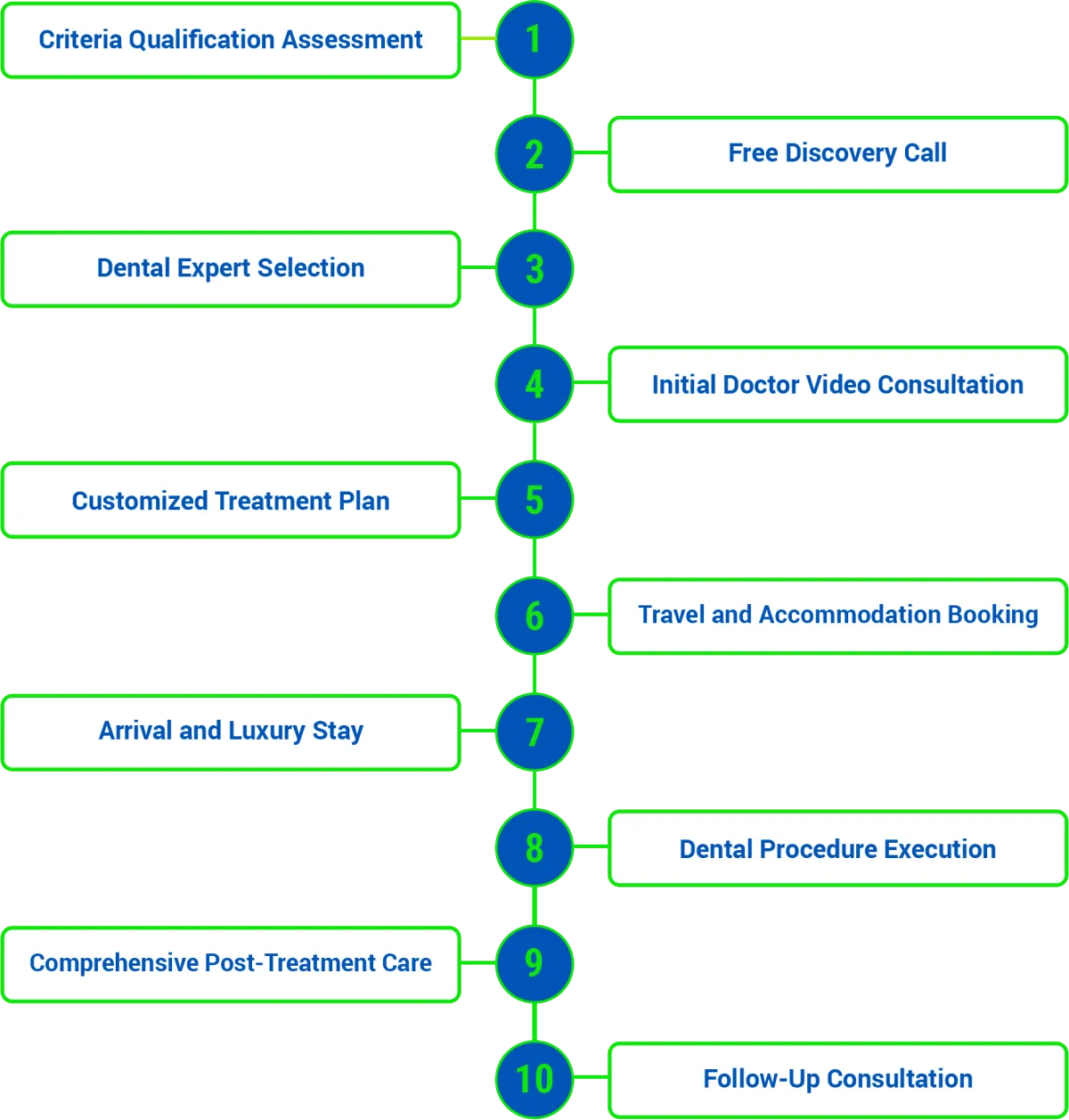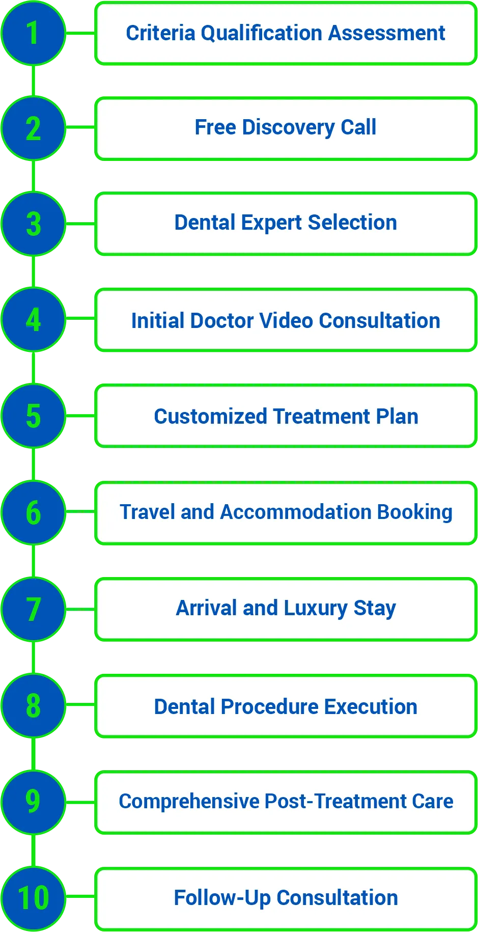 We start with a thorough eligibility check through a Criteria Qualification Assessment and a Free Discovery Call to determine if dental implants are the right solution for you. Our dental experts will review your specific needs and health conditions before proceeding.